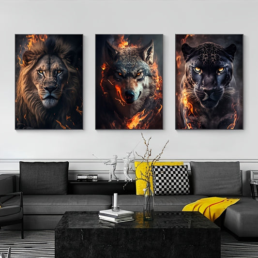 Set Of 3 Animal Canvas Wall Art Posters With Fire Effect Frameless Vintage Inspired Wild Animal Paintings For Living Room Decor Indoor Canvas Artwork